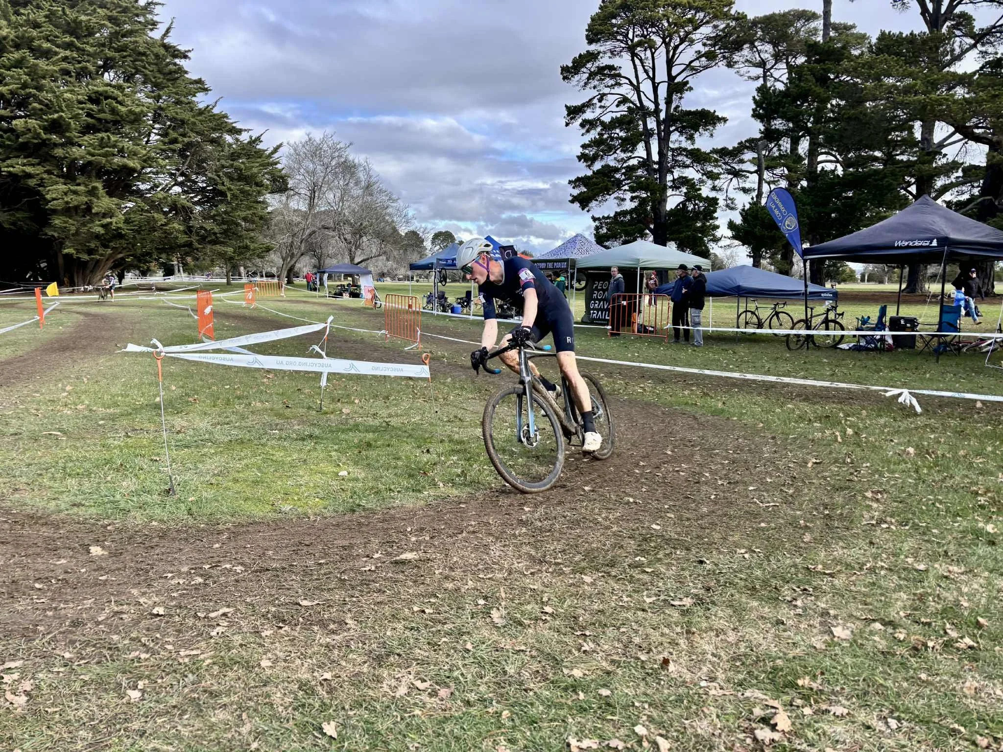 The circuit on Wadawurrung and Dja Dja Wurrung country was a mostly flat mix of mud and grass, with the exception of ‘The Mound’ - a large hill with multiple steep runups that riders tackled from three different angles. As with previous cyclocross races held in Ballarat conditions were wintry, with greasy mud in many of the corners and temperatures in the single digits.