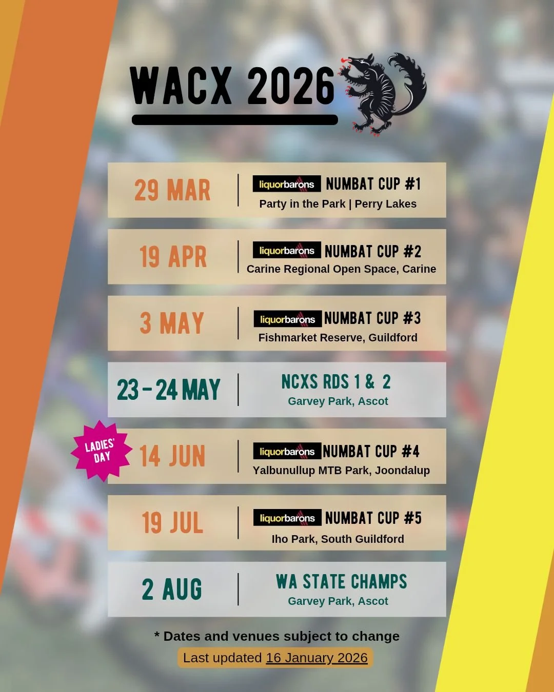 Acknowledgement: This race will take place on the traditional lands of the Noongar people. CX Down Under acknowledges the Traditional Owners of the land on which we ride, and their continuing connection to land, waters and culture. We pay our respects to elders past, present and emerging.